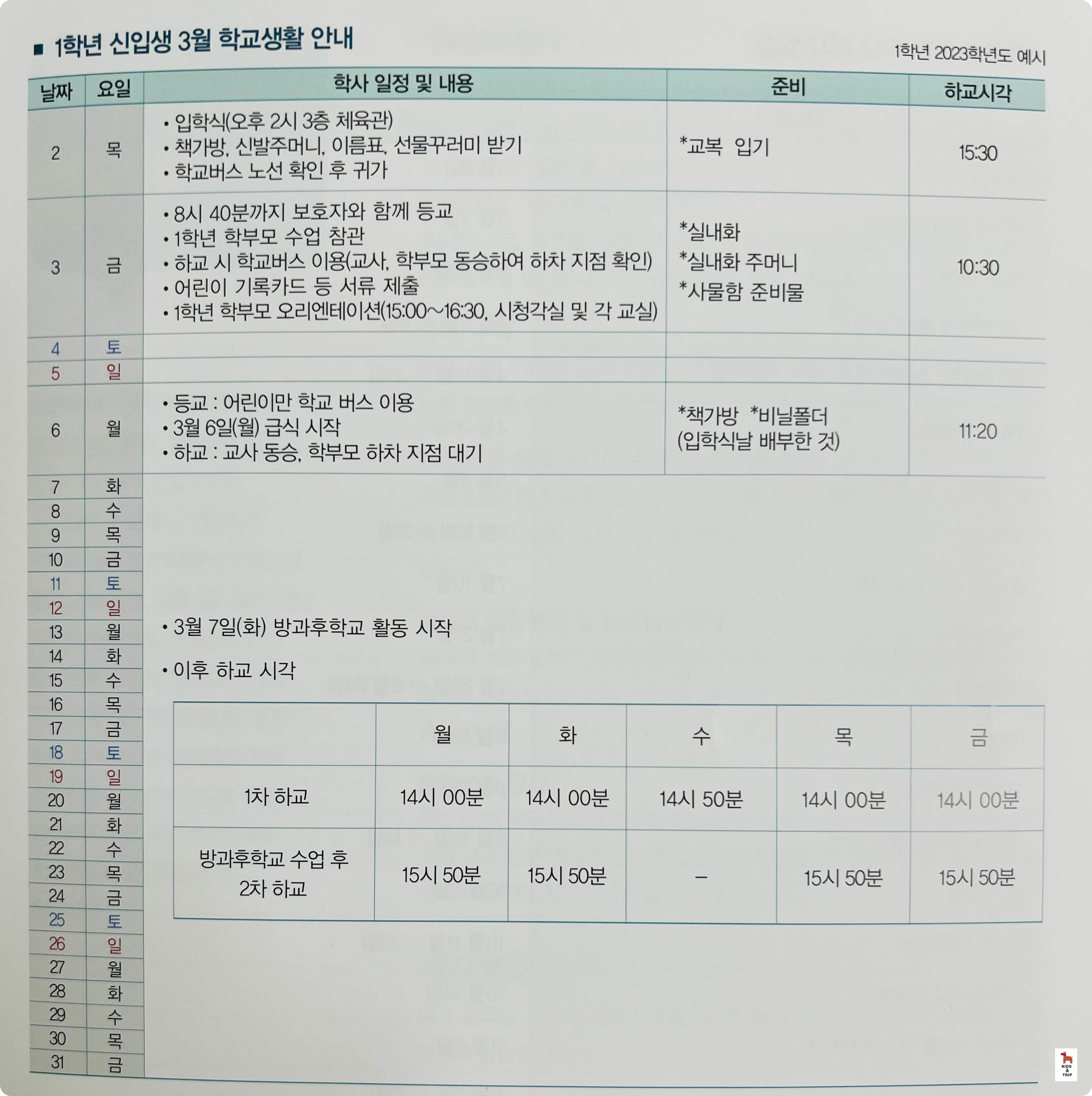 1st Grade Life March, Annual Key Academic Schedule